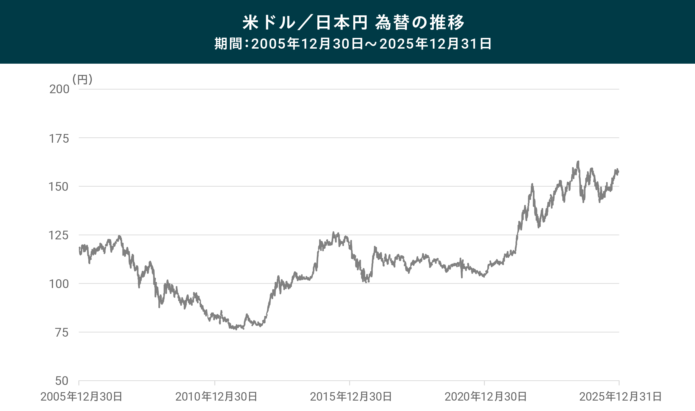 以下のグラフは2005年12月末〜2025年12月末までの米ドル/日本円の動きを表していますが、この20年間の動きを見ても概ねレンジ内で動いていることが確認できます。