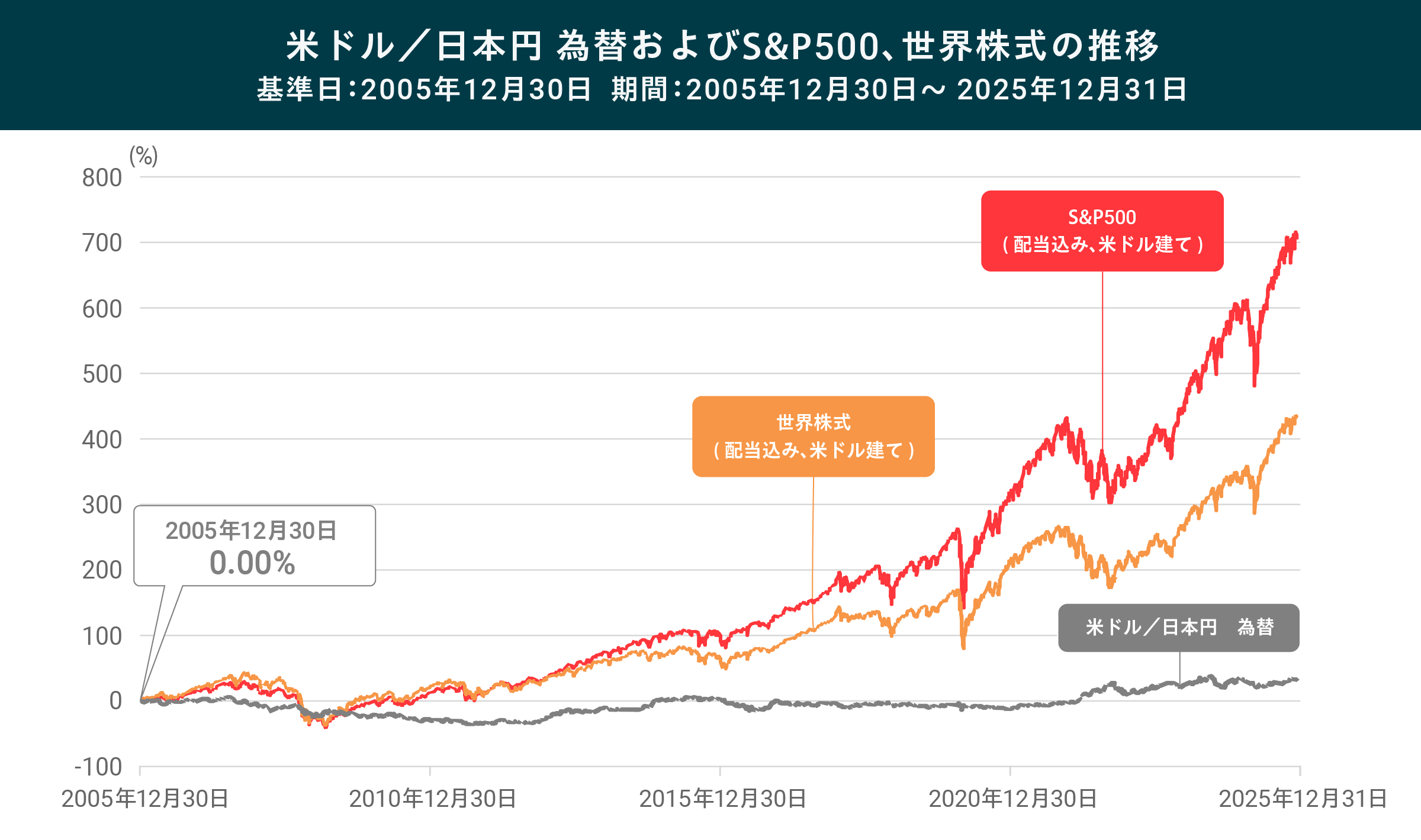 例えば米国株式は、基本的に米国の経済成長に連動するため、長期的には右肩上がりとなる傾向があり、実際に2005年12月末〜2025年12月末までの米ドル/日本円、S&P500(配当込み、米ドル建て)、世界株式(配当込み、米ドル建て)を確認しても、株価と為替の変動幅の差は一目瞭然です。