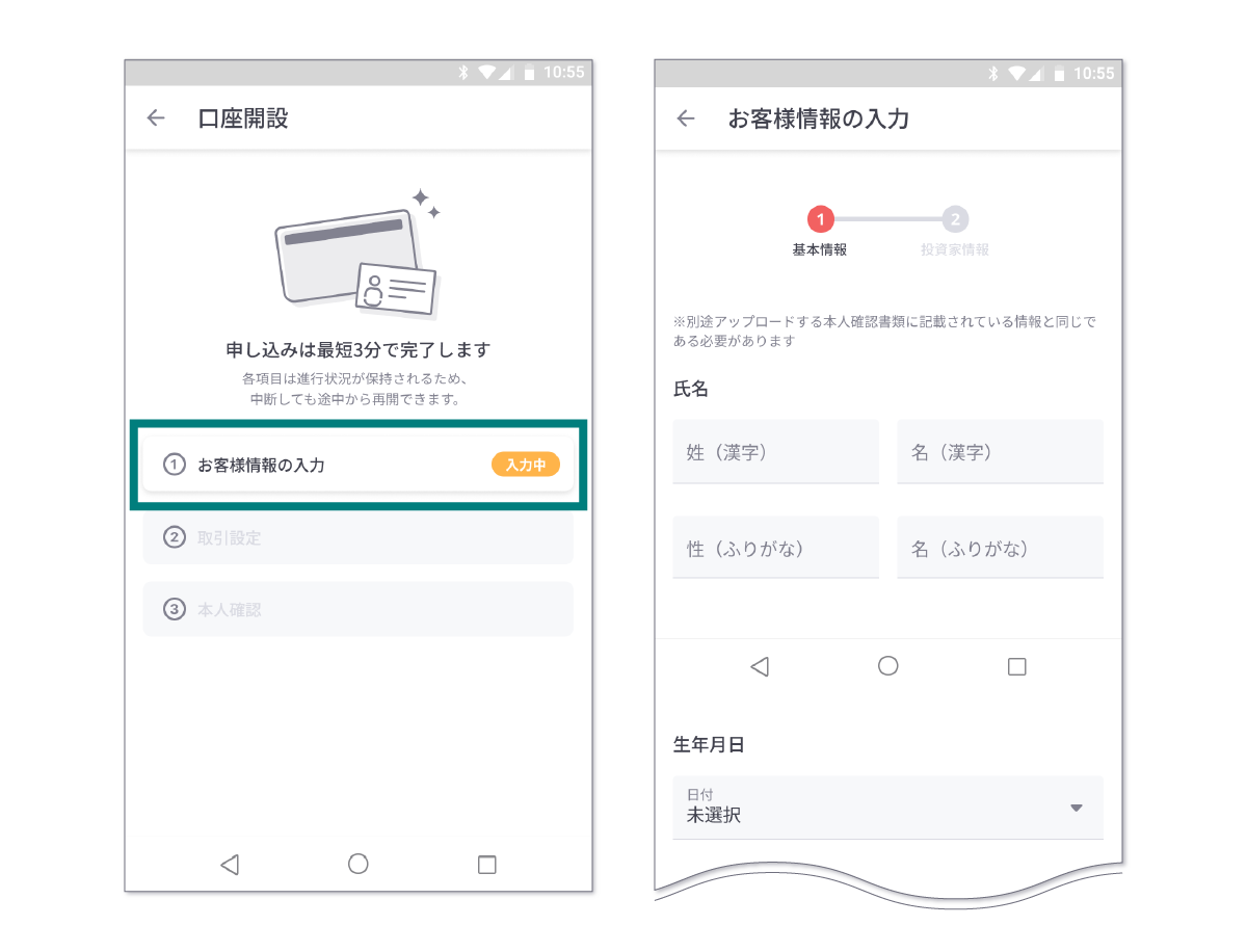 下記の画面に遷移しますので、「お客様情報の入力」に進み基本情報・投資家情報を入力します。