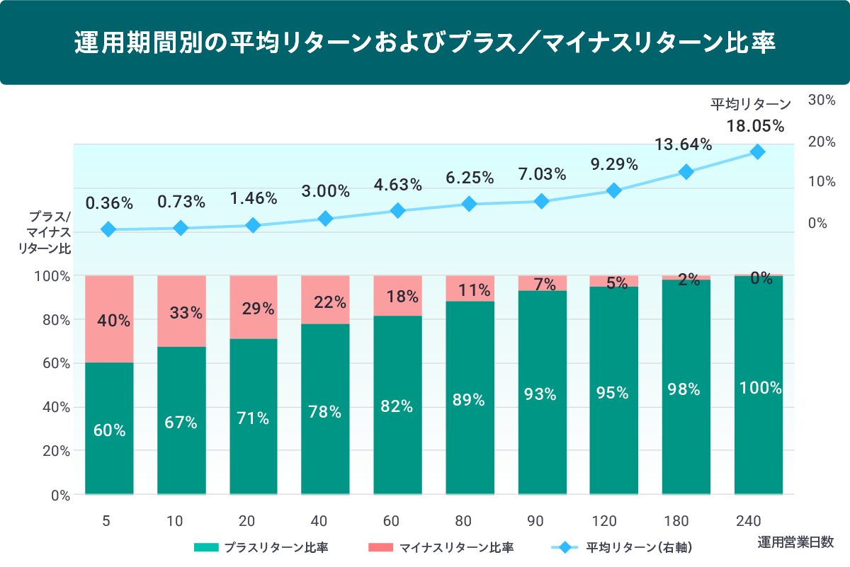 そして、運用を続けて90日(約4か月半)が経過すると、プラスリターンの割合は93%と9割超となっています。さらにその後も運用を続けると、プラスリターンになる割合はどんどん増えていき、約1年(240日)経過後には100%になっています。