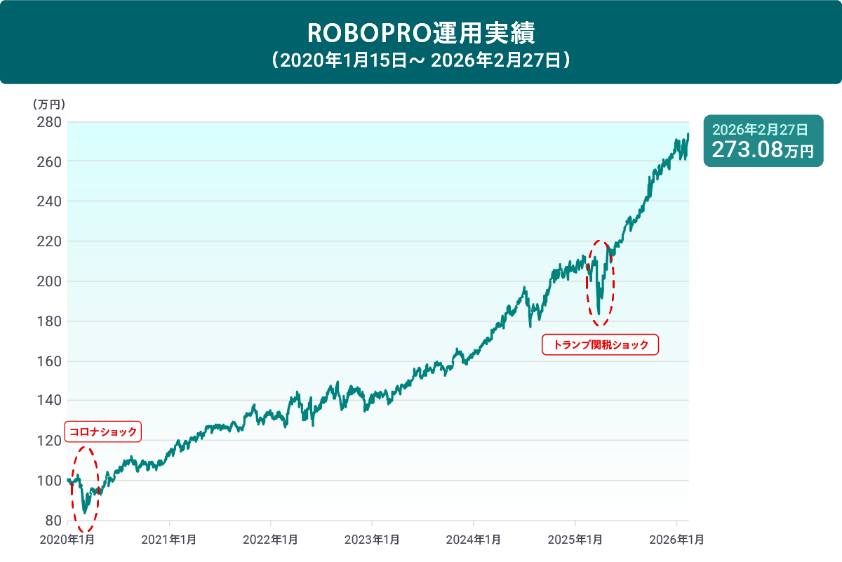 ROBOPROは2020年1月15日にリリースして、2026年2月末時点で約173%のプラスリターンとなっています。以下のグラフはROBOPROリリース時に100万円で運用を開始して、一度も売らずに運用を続けていた場合の推移で、約6年で約273万円になっていたことを示しています(税金等は考慮していません)。