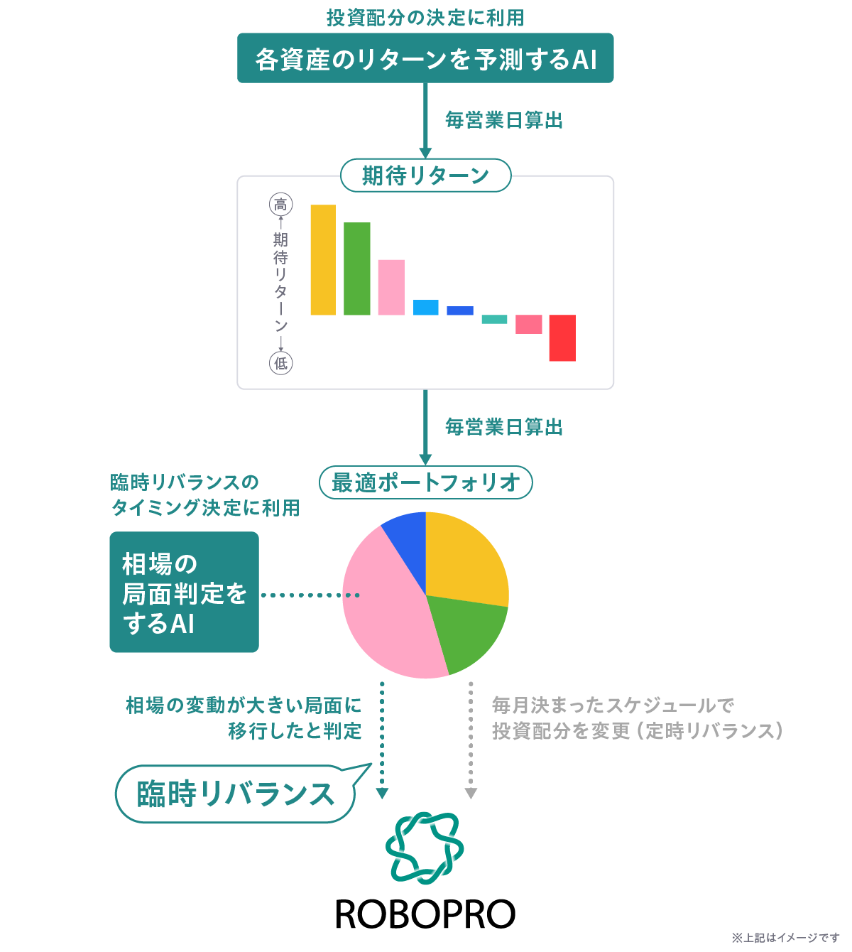 ・ROBOPROは「各資産のリターンを予測するAI」と「相場の局面を判定するAI」という2種類のAIを活用している。