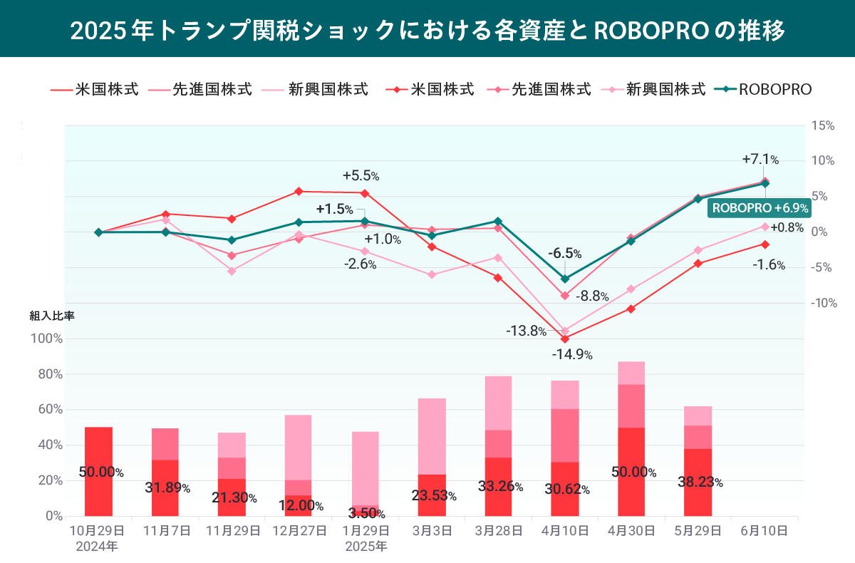 すなわち、トランプ関税ショック下で、ROBOPROは下落幅を抑制しつつ臨時リバランスをおこなうことで回復局面でのリターン獲得に成功したといえます。
