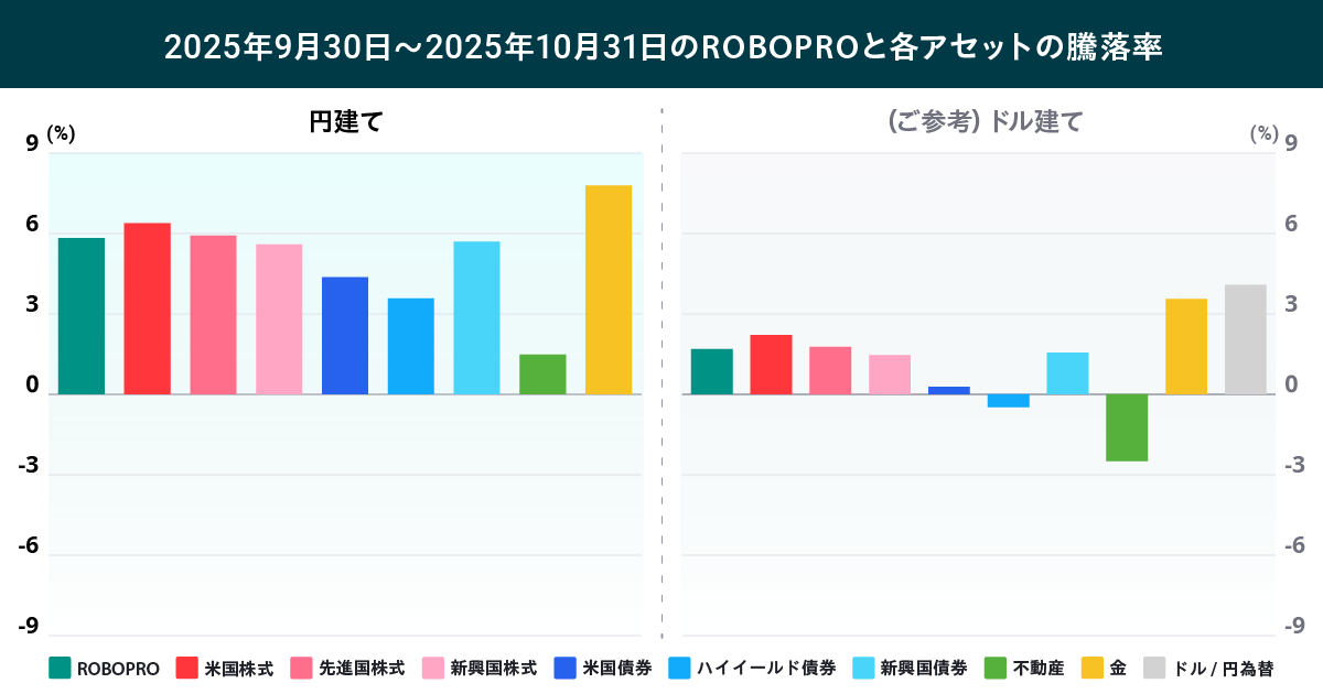 このようなマーケット環境における、直近1か月のROBOPROと各資産の騰落率(円建て/ドル建て)は以下の通りです。(※1、2、3)