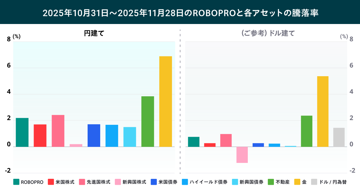 このようなマーケット環境における、直近1か月のROBOPROと各資産の騰落率(円建て/ドル建て)は以下の通りです。(※1、2、3)