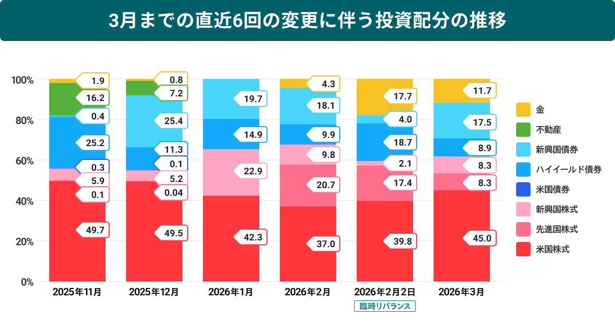 ※帯グラフの投資配分について、2025年11月は10月29日、2025年12月は12月1日、2026年1月は12月29日、2026年2月は1月29日、2026年3月は3月2日のそれぞれの変更時点の比率を示しています。2025年2月は、通常の変更に加えて2月2日に臨時リバランスを実施しました。