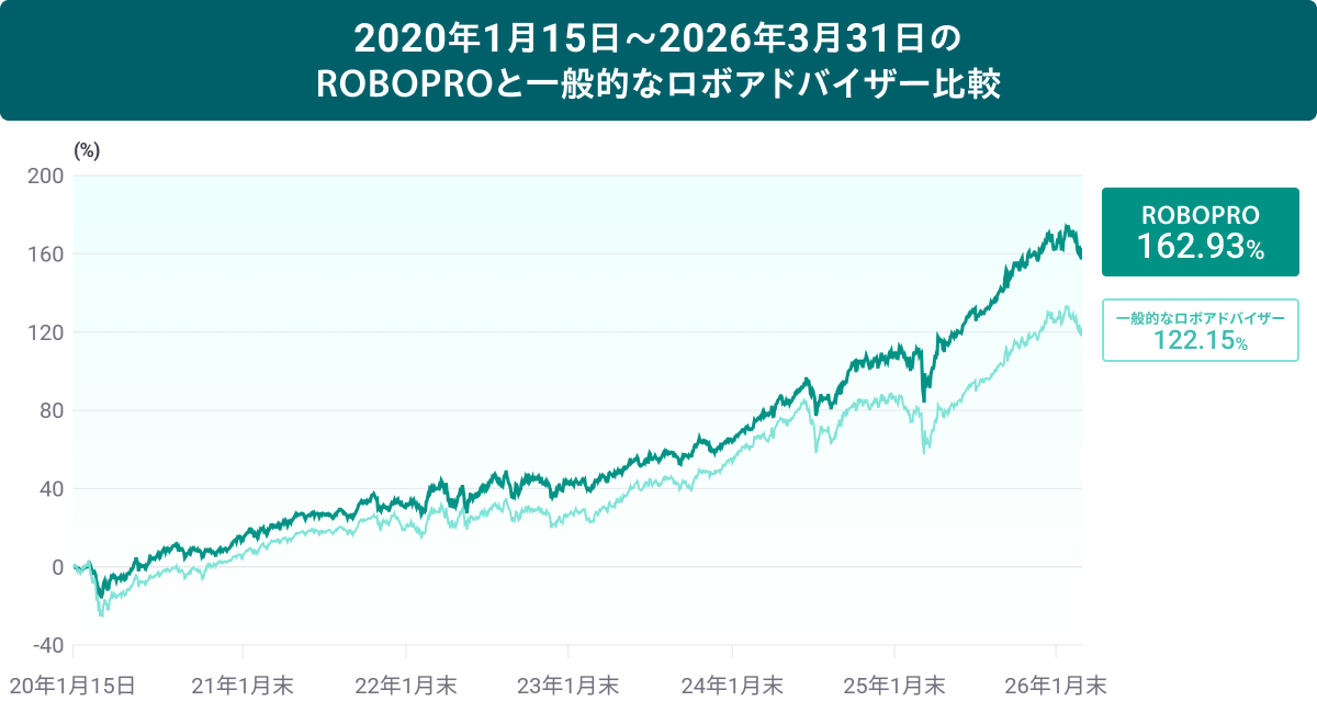 ROBOPROの運用実績は下のグラフのように推移しており、リリースされた2020年1月15日から2026年3月31日までの期間で見ると、3月31日時点で+162.93%(※4)となりました。