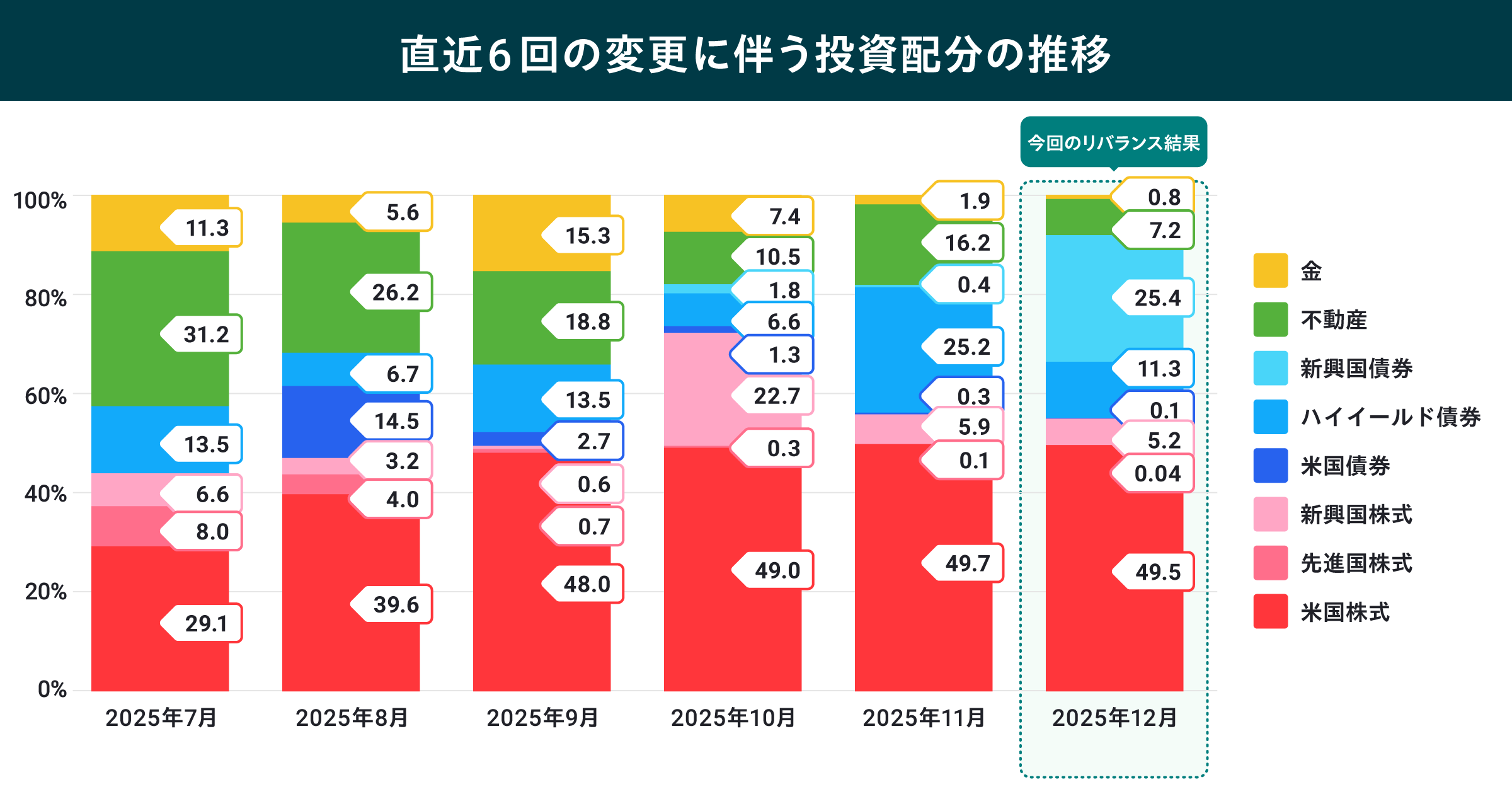 ※上記投資配分について、2025年7月は6月27日、2025年8月は7月29日、2025年9月は8月29日、2025年10月は9月30日、2025年11月は10月29日、2025年12月は12月1日のそれぞれの変更時点の比率を示しています。