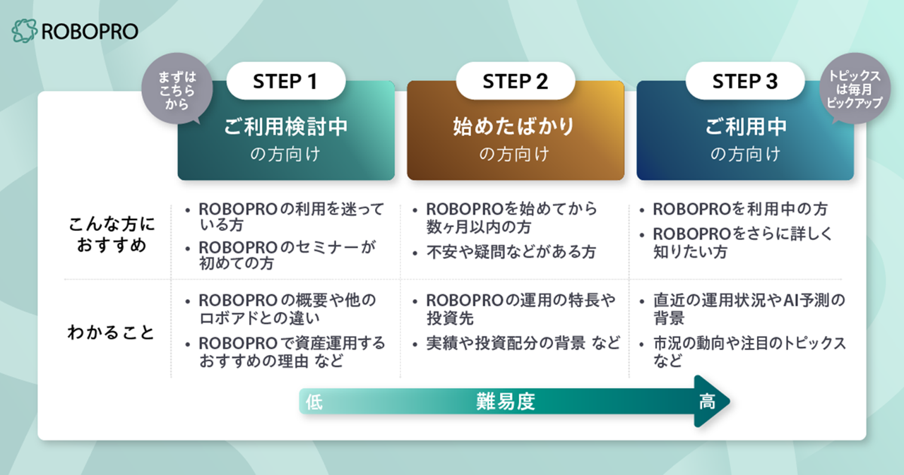 ROBOPROではAIによる予測技術を利用して最新のポートフォリオを提供しています。また、マーケット状況を踏まえたROBOPROの運用状況や投資配分の解説などについて詳しく知りたい方は是非セミナーにもご参加ください。